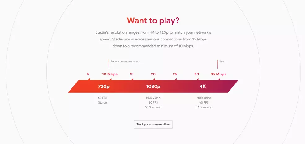 Detallado en la revelación, Google Stadia requerirá una velocidad mínima de Internet de 10 Mbps de bajada y 1 Mbps de carga para funcionar. Aquellos que quieran disfrutar del contenido 4K que se ofrece necesitarán al menos 35 Mbps de bajada para una “comodidad óptima”. Puedes probar tu velocidad en el sitio web oficial de Stadia si quieres estar seguro de que tienes una conexión adecuada.